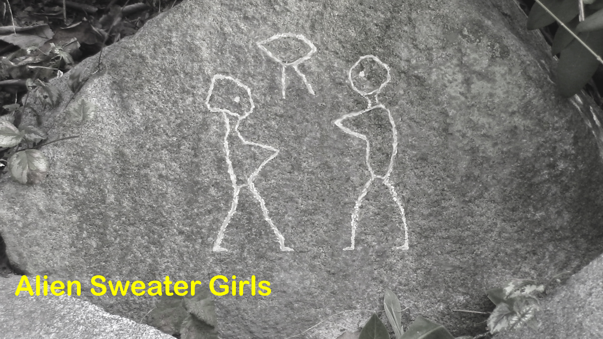 Marcie walking on a residential sidewalk, still carrying the toy car with the rope wound around it. Marvin sees her from across the street and calls to her. He hurries over to her. He looks at her pointy bullet bra breasts. He is a bit nervous to look at them. He asks Marcie if her ancestors were aliens. Marcie looks puzzled. He says he is wondering because she has pointy breasts, and he shows her a close up photo of the drawing on the boulder in his phone. Marcie says no, well I don't thinks so, well maybe. My parents are kinda weird if that means anything. I'm wearing a bullet bra, it's an old style from the 1950's. Marvin looks at her pointy breasts. Then he looks at the toy car and asks if it is photon powered. Marcie says no, that it might have had batteries but it doesn't work now and that they had to pull it with a rope. She looks at his strange hair and geeky appearance. Marcie might ask to see the photo again and they talk about the rock drawing. He says he is an ancient astronaut theorist and he gives her his card. They say goodby and part. Marcie continues walking.